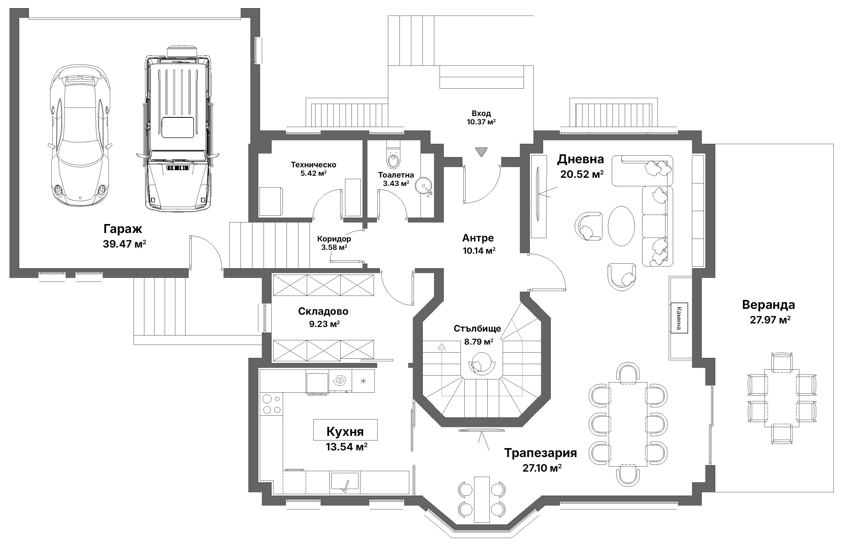 На първия етаж ви посреща обширна дневна и трапезария с директен достъп до уютна веранда, просторна кухня с остров и връзка към складово помещение, техническо помещение, тоалетна и антре, което осигурява комфортно движение и логичен поток между зоните.