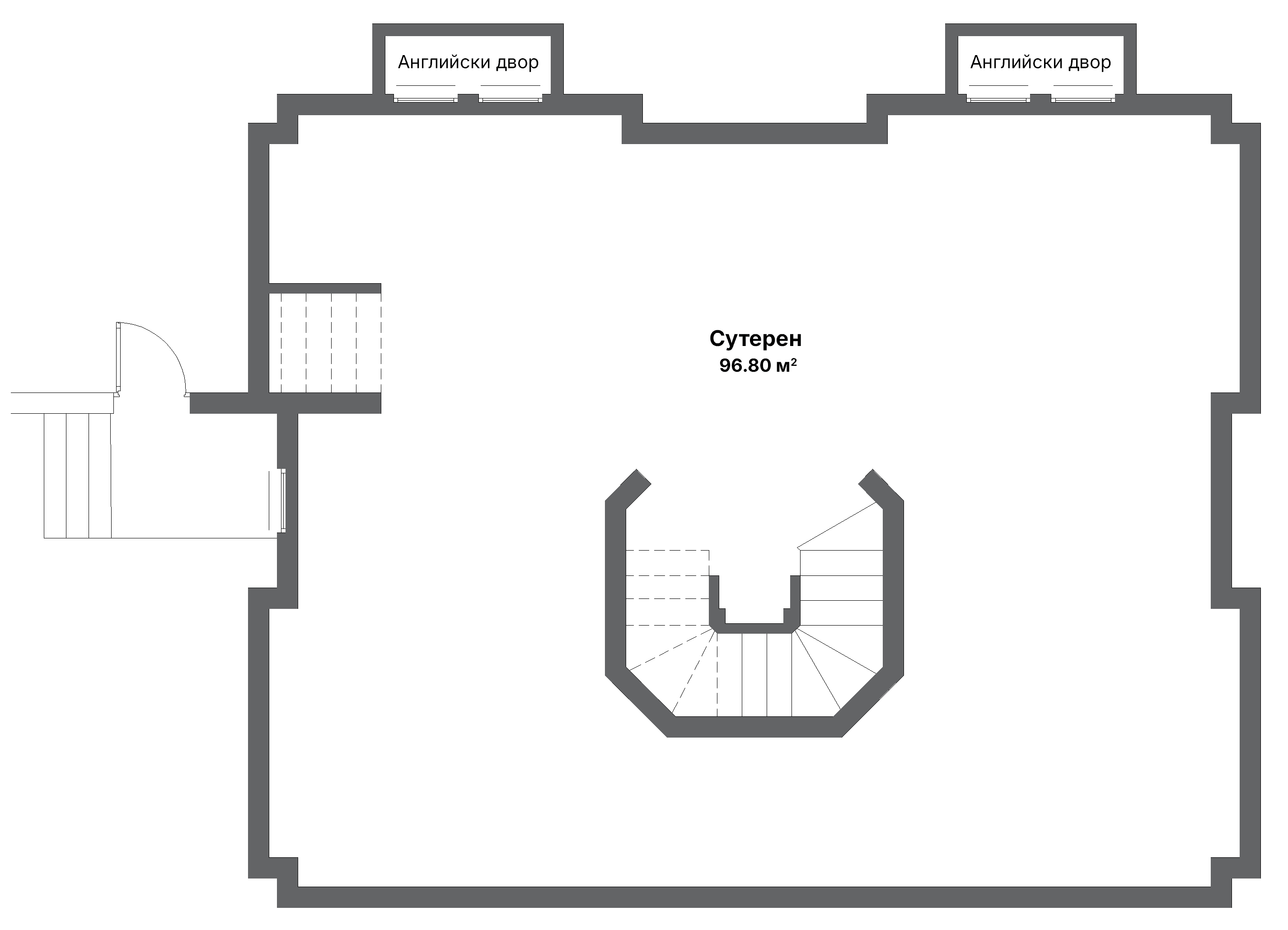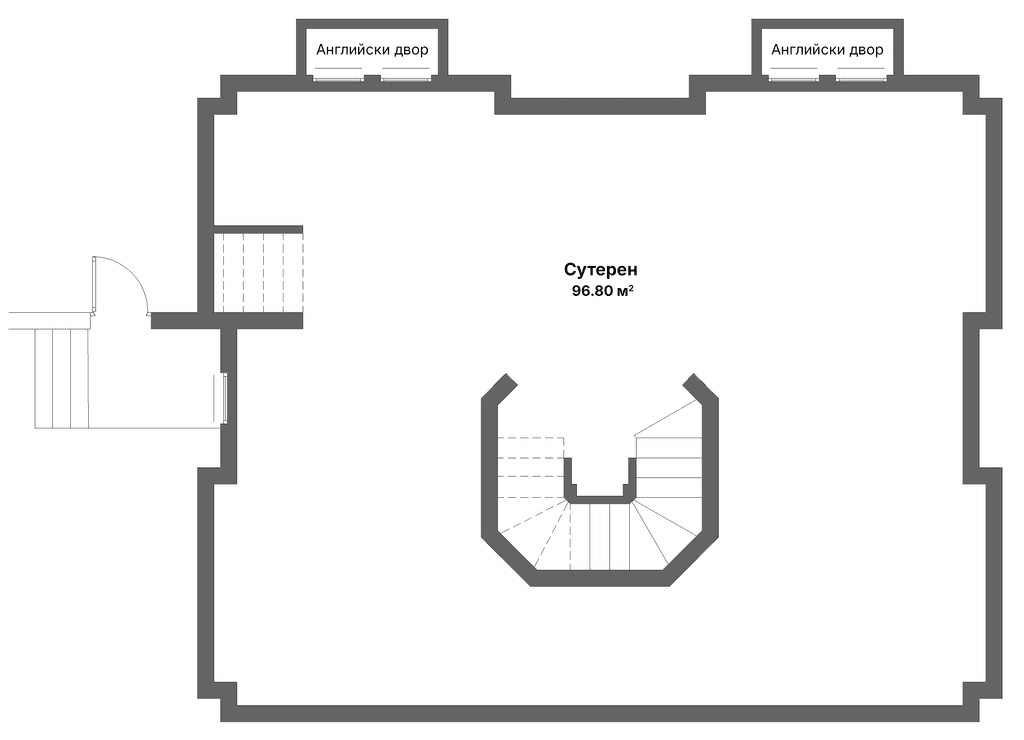 Просторен сутерен с естествено осветление чрез два английски двора, предвидена ВиК инсталация и директна връзка към двойния гараж. Пространство, което може да бъде оформено според нуждите - от фитнес, хоби стая до складова зона или винарна.